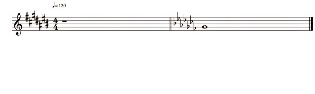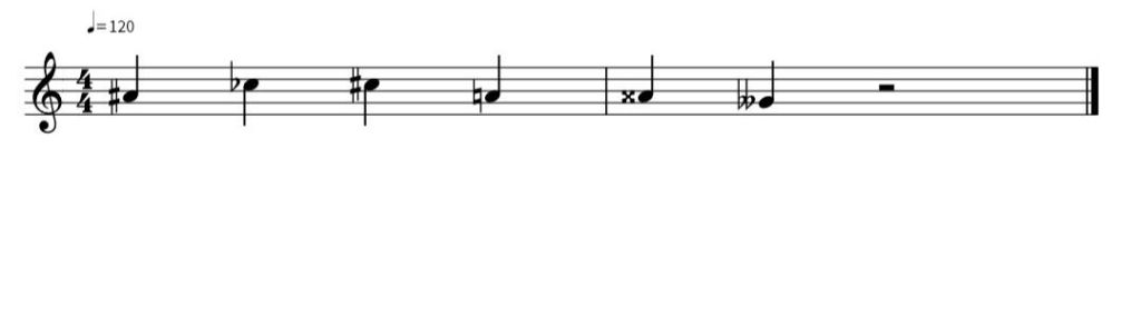 O exemplo acima demonstra notas com alterações, onde se pode reparar no formato dos símbolos. A primeira nota representa o lá sustenido, a segunda o dó bemol (como baixa meio tom passa a ser a nota si natural), a terceira nota representa o dó sustenido, a quarta o lá natural (com bequadro). No segundo compasso temo o lá duplo sustenido, que eleva um tom à nota, passando a ser o si natural. Já a segunda nota do segundo compasso corresponde ao sol duplo bemol, que abaixa 1 tom à nota, passando a ser fá natural.