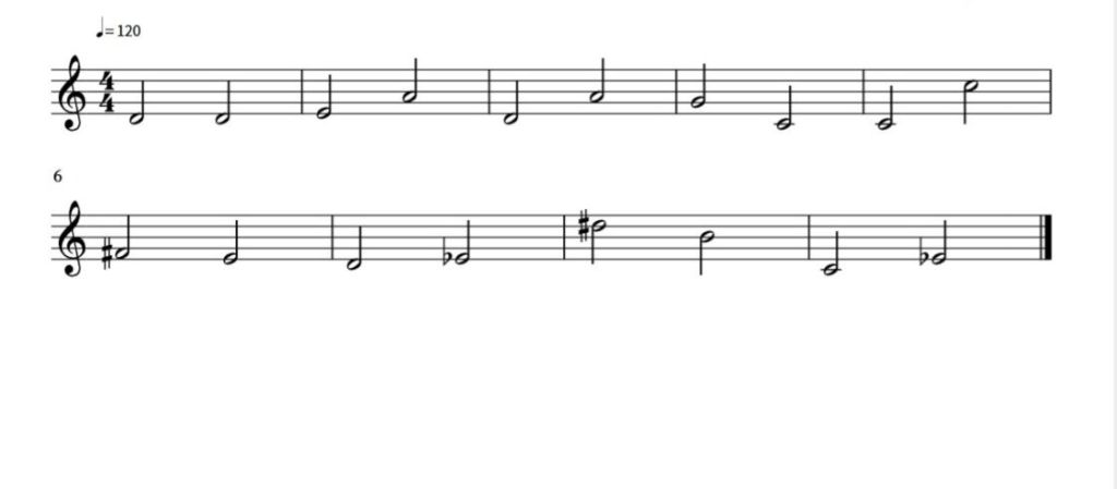 Já o intervalo do quarto compasso (com as notas sol e dó de forma descendente), significam um intervalo de quinta perfeita, com três tons e um meio tom. O compasso número 5 demonstra as notas dó e dó na oitava superior, indicando um intervalo de oitava perfeita. O compasso número 6, na segunda pauta, significa um intervalo de segunda maior, com as notas fá sustenido e mi. Já a seguir, temos um intervalo de segunda menor, com as notas ré e mi bemol.