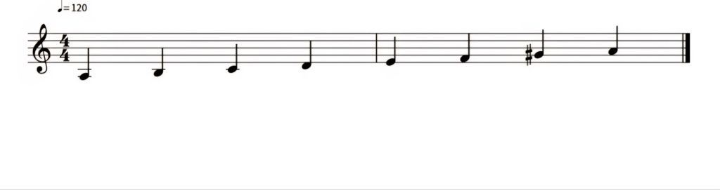 Podemos reparar em cima, no intervalo de segunda aumentada, entre os sons fá e sol sustenido. A escala menor melódica é diferente da escala menor natural, nos graus seis e sete (aumentam meio tom na forma ascendente). Já na forma descendente, voltam a ter o mesmo formato da escala menor natural. A imagem seguinte demonstra a escala de lá menor harmónica.