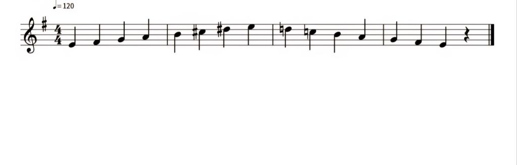 Podemos reparar na imagem anterior, que a escala de mi menor harmónica apresenta o sétimo grau (ré sustenido) aumentado meio tom, em relação à escala de sol maior. De seguida, é apresentada a escala de mi menor melódica.