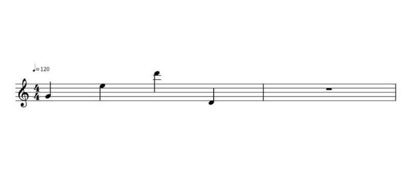 Neste exemplo, os compassos são separados por barras, onde temos 2 compassos. Logo no início da pauta está representada a clave de sol, e a indicação de compasso quaternário (representado por 4/4). As notas desenhadas na pauta correspondem ao sol, mi, ré e ré novamente, mas numa oitava diferente.