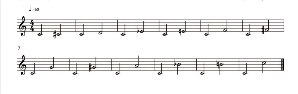 O exercício 1, demontrado na imagem seguinte, consiste em tocar a escala cromática de dó, sempre com o auxílio do dó, na base, após cada nota.