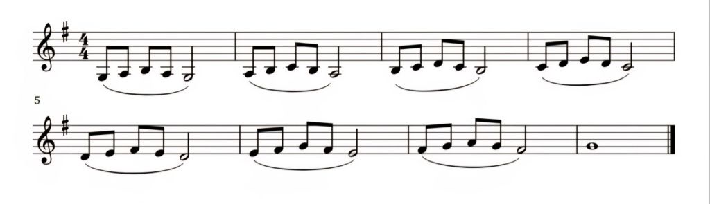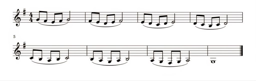O exercício acima, pode ser tocado com todos os intervalos ligados, onde neste caso está representado de forma ascendente. O ideal é, depois de terminar no dó médio, seguir com a mesma sequência até ao dó agudo. De seguida, o exercício está representado de forma descendente.