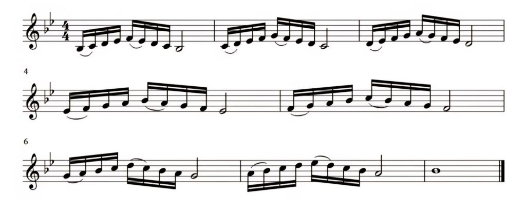 O exercício 3, em semicolcheias, também pode ser feito em tonalidades simples no início, e com ligaduras em todas as notas. Para variar e treinar a articulação, pode ser tocado com duas semicolcheias ligadas, e 2 semicolcheias separadas. A seguir, está exemplificado, em si bemol maior e em 1 oitava. Pode ser tocado em 2 ou 3 oitavas, dependendo do nível de aprendizagem do executante.
