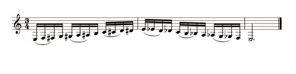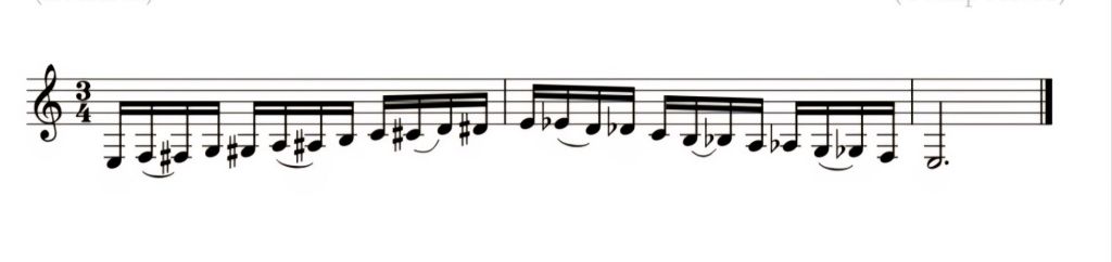 Como se pode ver na figura acima, estão representadas 4 semicolcheias com 2 notas ligadas e 2 notas articuladas, e assim sucessivamente. De seguida, temos o mesmo exemplo de escala cromática, com 3 notas ligadas e 1 nota articulada.