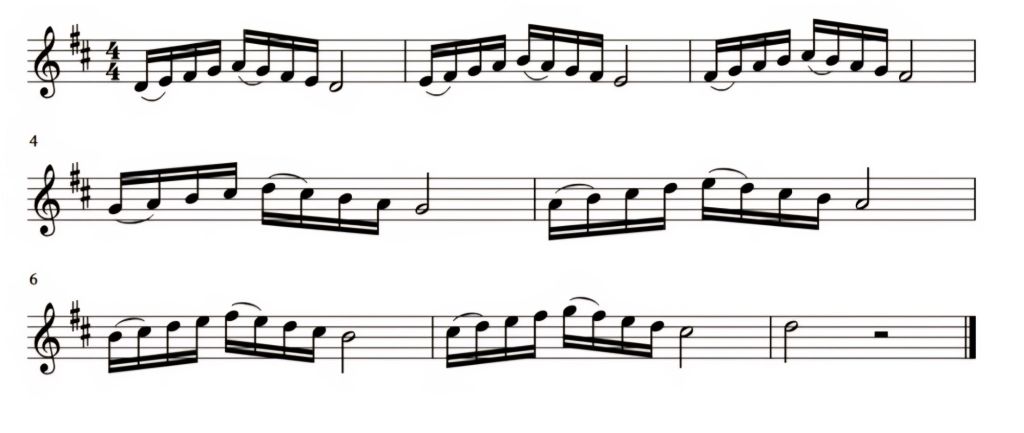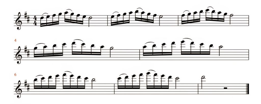 Uma maneira que pode ajudar a tocar o exemplo acima com mais segurança, é tocando as ligaduras com uma pequena acentuação (apoio). De seguida e em forma de exemplo, é apresentado o exercício 3, na tonalidade de ré maior.
